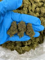 The buds of Gelato Cherry Pie are visually stunning, featuring dense, chunky nugs that are a vibrant green, interspersed with deep purple hues and frosty white trichomes. The striking contrast of colors enhances the strain’s appeal, making it an eye-catching addition to any collection. The buds are tightly packed and resinous, indicating their potency and quality. When broken apart, the nugs release a fragrant aroma, showcasing the rich cannabinoid content that awaits users.